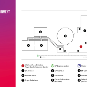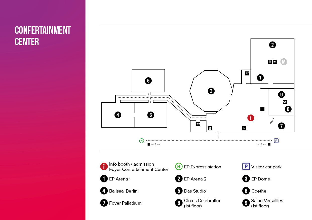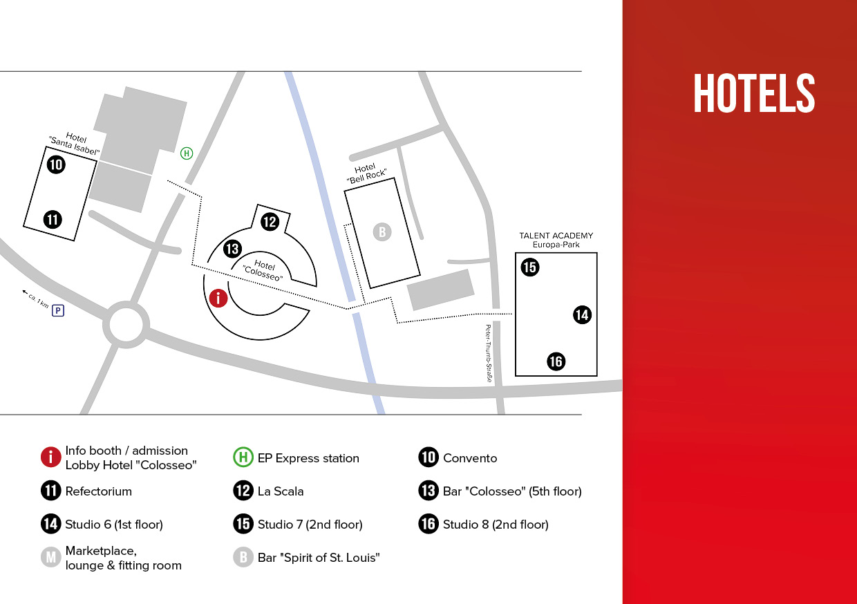 Please check where your rooms are located and remember to save some time for transfer with the “EP-Express” monorail (10-12 minutes), if you have to change between the Confertainment-Center and the Hotel-Area.